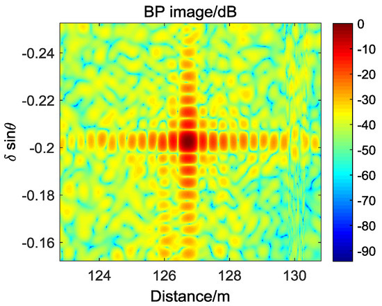 Taking into account the effective isolation between the T/R elements, the height difference between T/R arrays should be guaranteed in the sub-meter scale. Select −10 dB as the maximum acceptable PSLR without any window function, then the maximum acceptable height difference can be obtained as 8.7 cm, with which the imaging result of edge point can be shown in Figure 13.