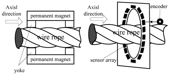 Wire rope consists of flexible ferromagnetic steel wires twisted in a helix structure around a hemp core. Based on quantum mechanics, the exchange coupling of an electron spin magnetic moment produces magnetic domains in ferromagnetic materials [25]. When there is not magnetisation, a ferromagnetic component produces little external magnetic field. However, when the nuclear charge is distributed consistently, saying that wire ropes magnetise, the component generates a magnetic field, namely the RMF. Based on this property, we designed a prototype device for the detection of wire rope defects. The detection principle is illustrated in Figure 2. First, a device consisting of permanent magnets as an excitation source was used to completely homogenize the magnetisation of wire rope. Then, a GMR sensor array and an ARM controller board were applied to obtain the RMF distribution of the wire rope.