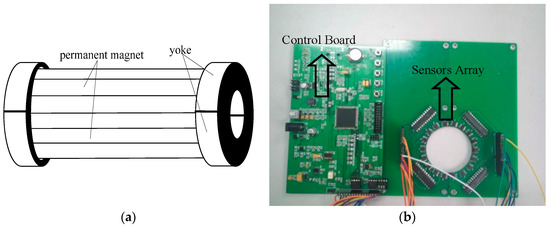 The excitation source of the device was constructed of small magnets placed end-to-end to form a magnetic strip. Two half-ring magnetic yokes held the strips and formed a semi-cylinder. The two semi-cylinders created a complete cylinder that was arranged on the surface of the rope. A schematic diagram of the excitation device and an image of the printed circuit boards of the system are shown in Figure 3. The magnetic sensors were AAH002 analog GMR sensors (NVE Corp., Minneapolis, MN, USA), and 18 GMR sensors were employed in the sensor array. The system control board consisted of an encoding module, signal amplifier module, array control module, data storage module, and CPU module. We employed an STM32F407 CPU core because it incorporates a 12-bit analog-to-digital converter (ADC).