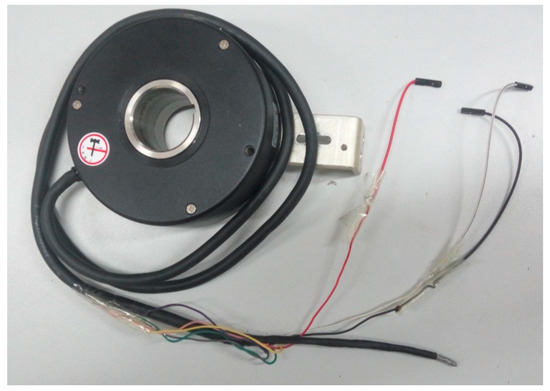 The magnetic sensitivity of the GMR sensors ranged linearly over 0.6–3 Oe (Gauss in air), and the 18 sensors were densely distributed around the wire rope. The ARM9 core controlled all system operations, and a TF card was used to store the raw RMF data. The sampling pulses were produced by the encoder shown in Figure 4). Equal-spaced sampling was implemented on the wire rope (1024 pulses while the inner circle of encoder rotated 0.35 m).