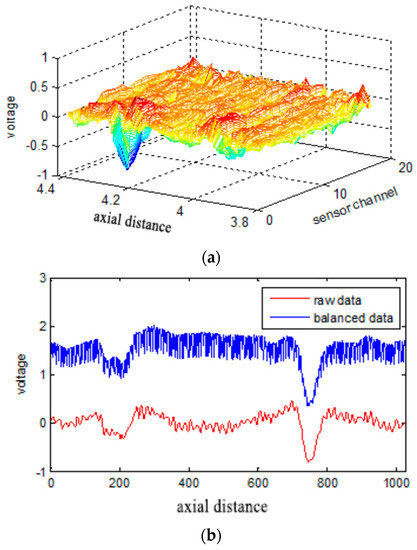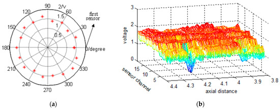 We collected RMF data from each of the GMR sensors with every pulse. Figure 5a shows the 18 data points obtained for a single pulse plotted in polar coordinates in intervals of 20°, where the radius represents the sensor voltage. After completing equal-spaced sampling, an M × N data matrix was obtained, where M is the number of sensor channels and N is the number of pulses received from the encoder. The data matrix was then expanded into two-dimensional images from first sensor channel. Figure 5b shows a segment of raw data expanded in the axial direction from the first sensor channel to the eighteenth.