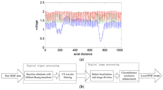 As shown in Figure 6b, the digital signal processing flow consists of two components, where one provides reprocessing for removing the DC component of the signal and suppressing low and high frequency noise signals, which ensures a balanced RMF signal. The HHT is more adaptive than wavelet analysis because an appropriate wavelet basis is often difficult to find. In addition, the sparsity of defects obtained in the RMF signal is ideally suited to CSWF [22].