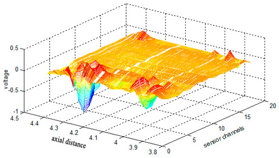 In this paper, CSWF is employed to suppress the high frequency noise and strand waves in the raw data. While the signal is not sparse in the time domain, it is sparse under the wavelet transform. The third Daubechies wavelet was selected to implement the Mallat decomposition algorithm. This type of wavelet has double orthogonality, and its shape is similar to that of the defect signal from contrasting the defect wave. The noise coefficients can be mapped to high frequencies, and the values of the noise coefficients are much smaller than those of the defect coefficients, which is helpful for reconstructing a sparse optimal defect signal by CSWF. For a defect signal of unknown sparsity, employing a slightly larger sparsity (K = 20) can ensure an accurate reconstruction. In addition, the majority of high-frequency coefficients were set to 0 so that the recovered signal was clean. Considerable memory and computation time was required for sampling and recovering the long discrete signal; hence, the signal was divided into several segments. The spatial length of each data block was about 2000 sampling points, and the wavelet transform level was 8 because the higher level the wavelet coefficient the more sparse it is. The proposed algorithm was applied to the raw data, and the image of a defect signal obtained from Figure 5b is shown in Figure 8.