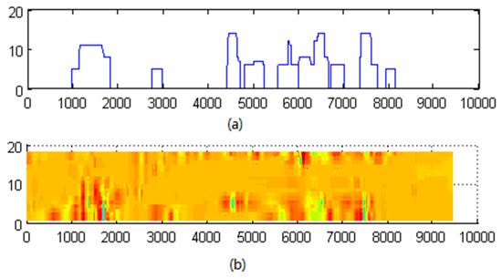 After morphological processing, the binary image is reserved in these regions and its amplitude is large. We mapped the binary image to the axial direction by summing up the binary values of all 18 channels at each sampling point. This provided an amplitude curve reflecting the axial location of defects. In addition, the defect image was extracted from the wire rope RMF image. Figure 9 presents a comparison of mapped binary data with the original filtered RMF image, which indicates that the mapped data provides the locations of defects in the RMF image.