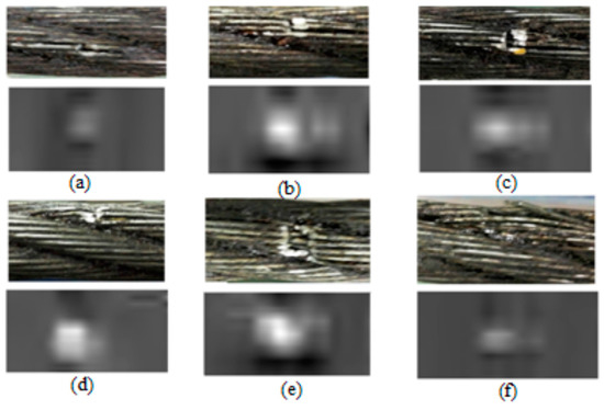In this paper, the diameter of the sensor array was 50 mm and the number of sensors was 18, so the circumferential resolution of the detector was poor, which is detrimental for extracting the characteristics of the image. Therefore, the spline interpolation method was used to improve the resolution by interpolating the number of circumferential points to 200. Figure 10 presents images of several broken wires and their corresponding gray-level RMF images.