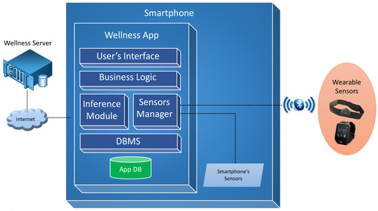 The DBMS module manages the database and the persistence of the Wellness data. Moreover, it also provides mechanisms for the exchange of information between the app and a Wellness Server [24], through the use of apposite REST services, for data synchronization, historic data recovery and the updating of the user’s goals.