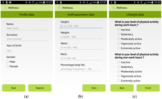 Screenshots of the Wellness App: (a) General Information; (b) Anthropometric Information; and (c) Lifestyle Information.