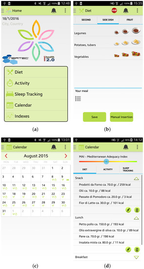 Screenshots of the Wellness App: (a) Main Menu; (b) Insertion of a new meal; (c) Calendar; and (d) Details.