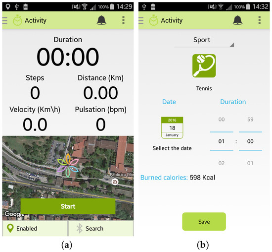 Figure 4. Screenshots of the Wellness App relating to physical activity: (a) Automatic insertion of a new activity; (b) Manual insertion of a new activity. - the “manual monitoring” of activities that permits the user to manually select the kind of activity performed, the duration, and the date, as shown in Figure 4b. This option has been devised in order to give the user the possibility of freely performing the activity, without the necessity of carrying her/his smartphone, and then inserting the type and the amount of the activity performed. Some examples of which kinds of activity can be manually inserted in the Wellness App are reported in [10].