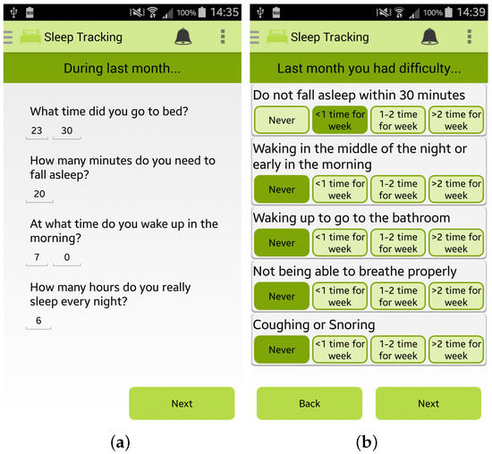 Finally, the app permits the user to estimate her/his sleep quality by completing the PSQI questionnaire, one of the most popular tools for assessing the quality of sleep [28], as shown in Figure 5a,b.