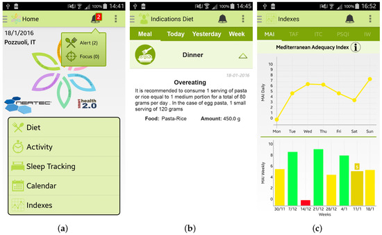 Every day, or every time the user inserts any new data, the app automatically estimate different indicators, such as the Mediterranean Adequacy Index. Every time the app detects an anomalous situation, it promptly alerts the user, as shown in Figure 6a,b. By clicking on the alert, the user can visualize the personalized recommendations to follow to improve her/his wellness and lifestyle. It is important to note that all the recommendations provided by the app are based on expert knowledge formalized in close collaboration with the medical team of the University of Magna Graecia of Catanzaro (Italy) involved in the SmartHealth 2.0 project. Finally, all the calculated indexes are available to view by selecting the Index button from the main menu of the app, such as, for example, the MAI index in Figure 6c.