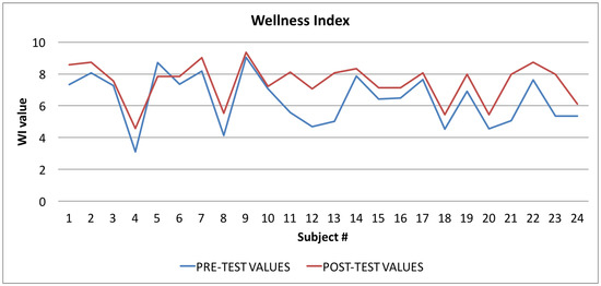 In Figure 8 the graph showing the average values of the Wellness Index (WI) is reported: the values calculated at the beginning of the trial phase are in blue, and the values calculated at the end of the trial phase are in red. The figure shows that, in the vast majority of cases (96%), there was an improvement in the value of the Wellness Index.