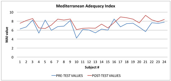 In Figure 9 the graph showing the average values of the Mediterranean Adequacy Index (MAI) is reported: the values calculated at the beginning of the trial phase are shown in blue and the values calculated at the end of the trial phase are shown in red. As for the WI index, the figure shows that, in most cases (92%), there was an improvement in the Mediterranean Adequacy Index.