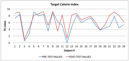 Target Calorie Index: averages of the values calculated at the beginning (blue line) and at the end of the trial (red line).