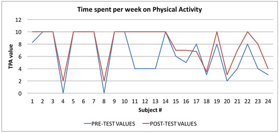 Time spent per week on Physical Activity Index: averages of the values calculated at the beginning (blue line) and at the end of the trial (red line).
