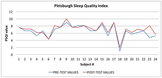 Pittsburgh Sleep Quality Index: averages of the values calculated at the beginning (blue line) and at the end of the trial (red line).