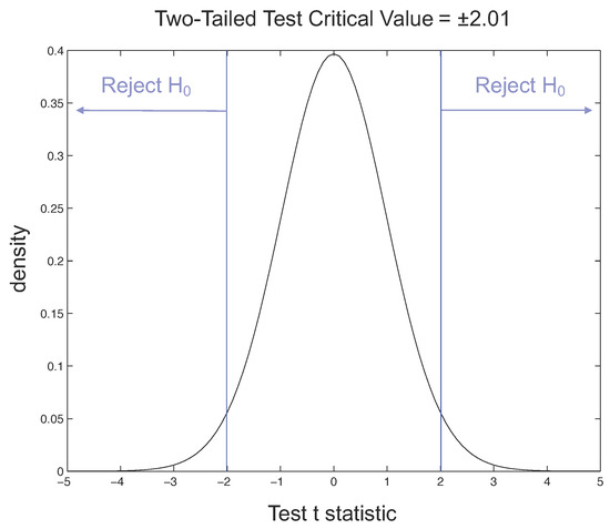 Considering the t-Student distribution, if we have and a value of the degrees of freedom equal to 46, for our two-tailed t-test the critical value is 2.01. The rejection regions are shown in Figure 13, where the probability density function of the normal distribution, also called the Gaussian curve, is drawn and the tail, where observations lead to the rejection of the null hypothesis, is indicated.