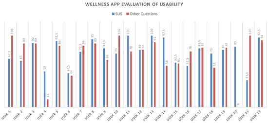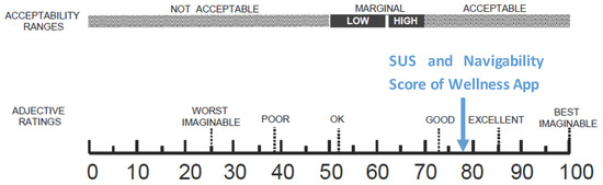 The number of collected questionnaires was lower than the number of people involved in the trial study (22 questionnaires out of a total of 40 installed apps) due to the poor turnout at the last meeting. Starting from the collected data concerning the SUS, the level of usability and acceptability of the app [38] could be evaluated by means of the qualitative adjective [37]. As shown in Figure 15, both the SUS and the Navigability scores obtained from the evaluation of the Wellness App are collocated between Good and Excellent values.