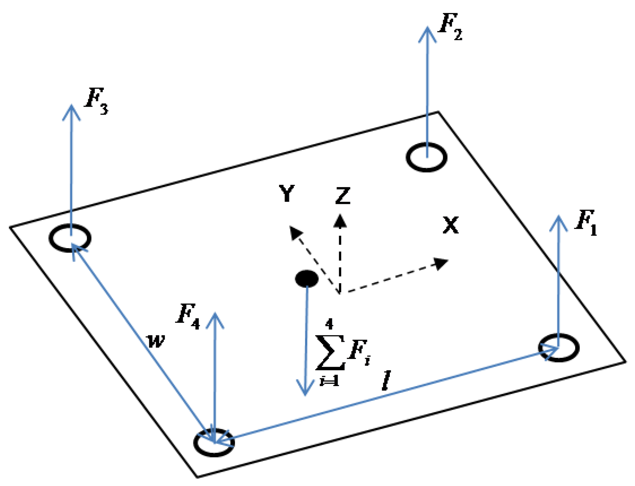 Assuming that the readings of the four load cells at the four corners of the force platform are , , , and , then the moment about the Y axis can be represented as , which is equal to the product of COP X coordinate and the summation of forces in the Z direction [4]. Therefore, the COP coordinates in the X and Y direction can be calculated using Equations (1) and (2), respectively.