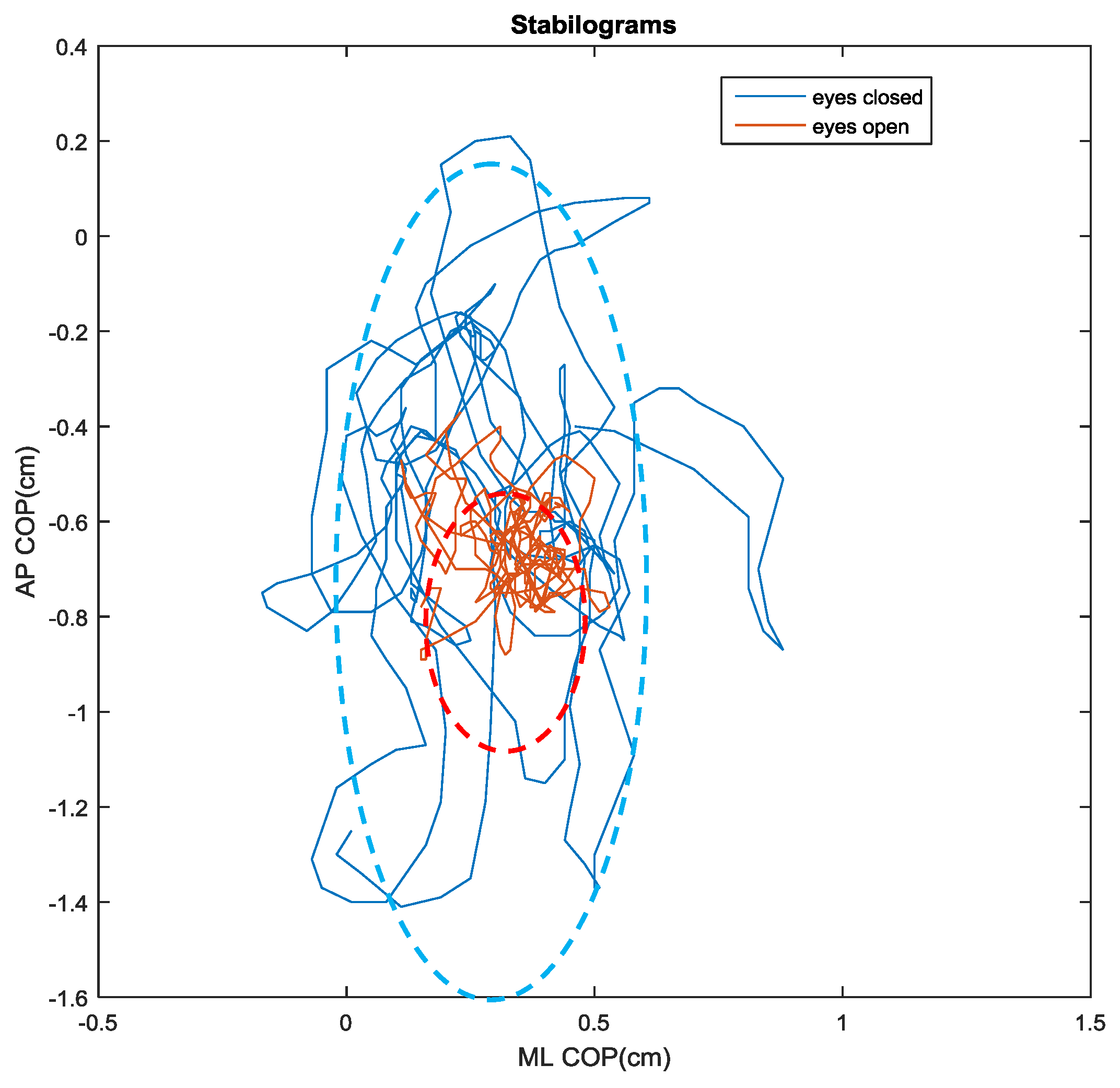 Two exemplary stabilograms with/without visual feedback during quiet, upright standing are shown in Figure 5. It clearly demonstrates that the COP trajectory is more random but less variable with eyes open compared to eyes closed. The COP motion also demonstrates greater instability along the AP direction than the ML direction as indicated by the elliptical shapes in Figure 5.