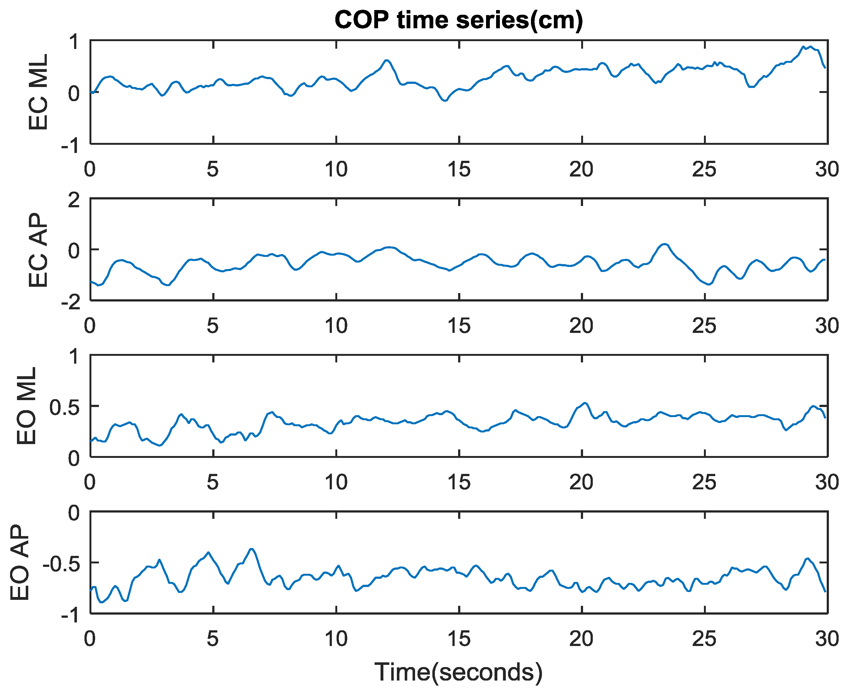 The same data is also shown in Figure 6 as the time series of COP trajectories along the ML and AP directions for eyes open (EO) and eyes closed (EC) conditions. It appears that the trajectories with eyes open demonstrate greater irregularity and smaller variability, suggesting an increase in the efficiency or automaticity of postural control. This is consistent with the previous study that shows that regularity of COP trajectories increases as the amount of attention invested in postural control increases (eyes being closed) [15,16].