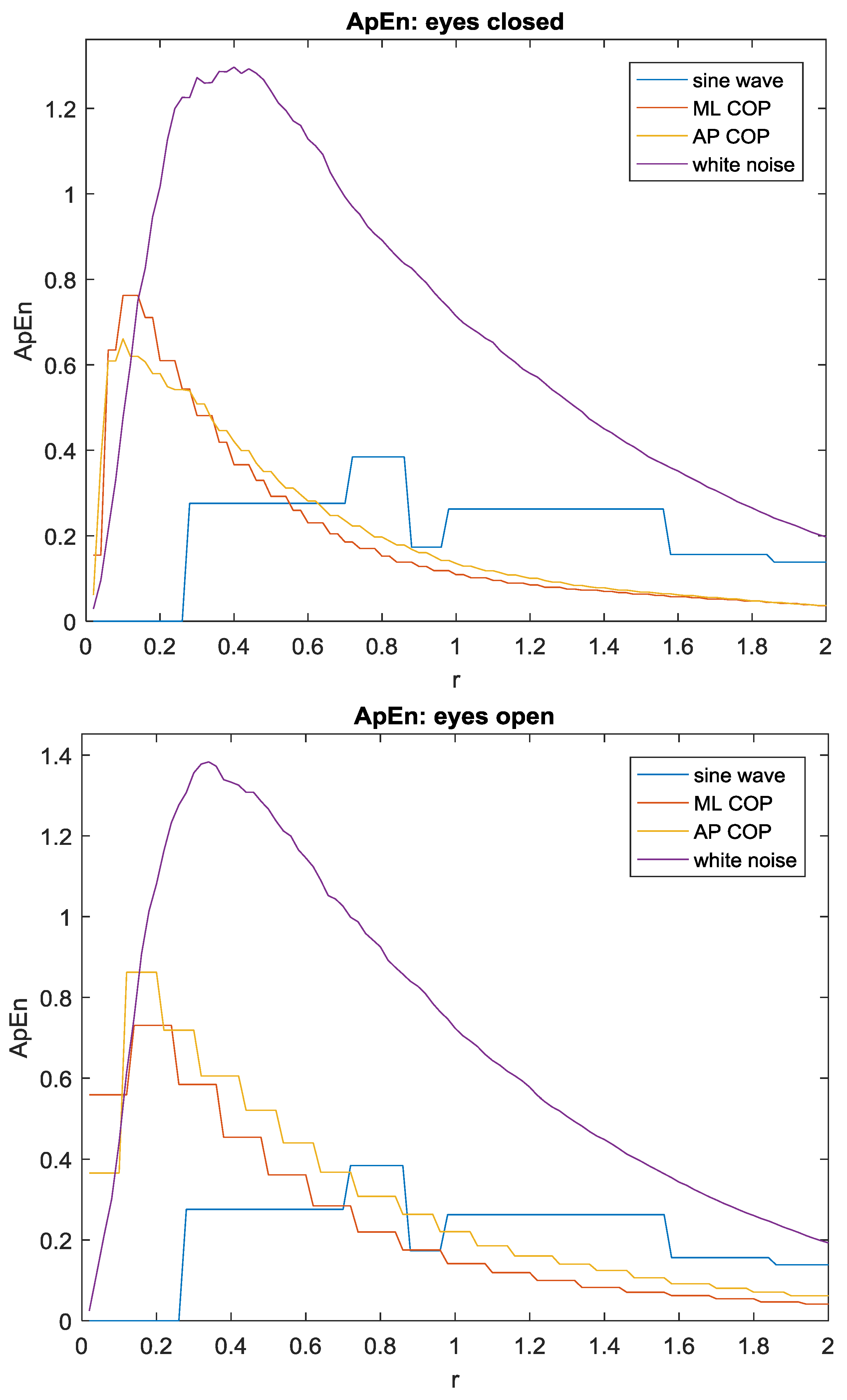 Many researchers have studied balance impairments. Approximate entropy has been widely used as a biomechanical measure of postural stability [5,6,7,8,9,10,11]. Cavanaugh et al. used ApEn to detect subtle changes in COP oscillations when a secondary cognitive task was introduced [5]. Cavanaugh et al. [6] also used ApEn to assess changes in the randomness of COP oscillations after cerebral concussions. It was suggested that quiet standing with eyes open and closed on a stable platform may be the only sensory conditions that need to be assessed. Further research [7] revealed that ApEn values for COP time series provided important information related to the status of concussion. Overall, prior research [8,9,10] indicates that measures of postural stability would provide a useful clinical tool for return-to-play decisions in sport.