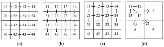 In general, Wallis dodging involves two images (i.e., the reference and target images). When several images are obtained, the images should be dealt with individually. Four processing sequences are mainly used to adjust the color of multiple images, as shown in Figure 1. Each image is adjusted based on its adjacent left or upper image, as shown in Figure 1a,b. Another method is shown in Figure 1c. The images, except those located on the boundary of the block images, are adjusted twice. An adjustment method based on the four-fork tree is proposed according to the idea of quadtree coding [26]. Four adjacent images are defined as child nodes. Four child nodes form the parent node. Then, four parent nodes are calculated to complete the entire image processing. The correlation between adjacent images is considered in this method, and the suture transition processing method [27,28] is used for color images. Although the processing results of the method are unaffected by the processing order [29], this method is limited by the number of images. The small block may lose a considerable amount of gray-level information because of multiple computations.