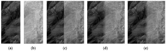 The Wallis dodging algorithm can be used to modify the brightness and contrast of multiple images. According to the statistical mean and variance of the selected reference image, the linear distribution of the gray level of the target image is adjusted by the Wallis filter using Equation (2):
