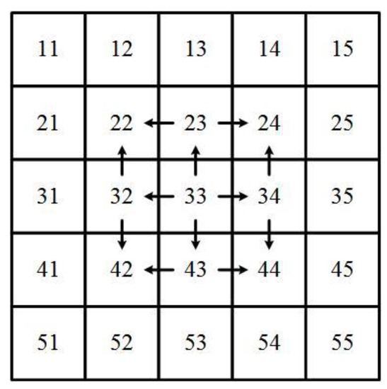 The existing Wallis dodging algorithm is only suitable for keeping the color and brightness consistency between two images or a few images. The adjustment order and parameter calculation methods are improved to ensure that the Wallis dodging method is suitable for color balance of large-scale SR images. The processing procedure of the proposed algorithm is that the image in the middle is selected as the first standard image and other images in four directions are adjusted gradually, as shown in Figure 3. The images at the same line or column as the first image are modified based on a contiguous image. The other images are based on its two adjacent images.