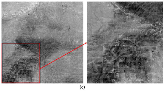 A total of 900 images are processed with the five methods for another comparative experiment to further illustrate the effectiveness of the improved Wallis dodging algorithm for large-scale SR images. The processing methods shown in Figure 1a,b, which ignore the correlation between different rows (columns), are simply suitable for the color balance of a few images. These methods will lead to a belt-form image for large-scale images, as shown in Figure 10a,b. In areas with a relatively large difference of object reflectivity, the phenomenon of exposure will occur, resulting in serious distortion of the image. The processing methods shown in Figure 1c, in which the reference images of one target image are its left and upper adjacent images, may cause partial loss of gray-level information. This phenomenon may also make the contrast of adjacent images obvious, as shown in Figure 10c.