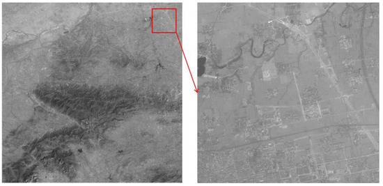 In order to prove the effect and significance of SR reconstruction algorithm, ZY-3 forward and backward panchromatic images with a resolution of 3.6 m, as shown in Figure 5a,b, are reconstructed by the blind SR reconstruction algorithm. The reconstructed image and its details are shown in Figure 5d. The edges of the building and road in the reconstructed image are much clearer and more distinct than that in the original images. Moreover, the result is also better than the image shown in Figure 5c, which is obtained by the bicubic interpolation method. The nominal values of metric of two reconstructed images are shown in Table 1. The metric of the image based on the blind SR reconstruction algorithm is high, showing that the blind SR reconstruction algorithm has a good visual performance and detail preservation. In summary, Image SR reconstruction can effectively produce robust and clear high-resolution images.