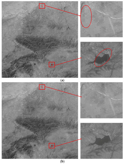 In summary, the resolution of original ZY-3 forward and backward images shown in Figure 15a,b is enhanced by the blind SR reconstruction algorithm. Then, the difference in brightness and contrast among sub-block SR reconstructed images is eliminated using the improved Wallis dodging algorithm. Finally, a high-resolution image mosaicking without a seam line is obtained, as shown in Figure 15c. As we can see from Figure 15, the building and road in the two original images are fuzzy, while the edges of the building and road in the final image are clear and distinct, with more details.