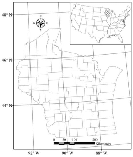 The selected study area, Wisconsin State, is located in the Midwest of the United States, and is composed of 72 counties with a geographic area of 169,639 km
