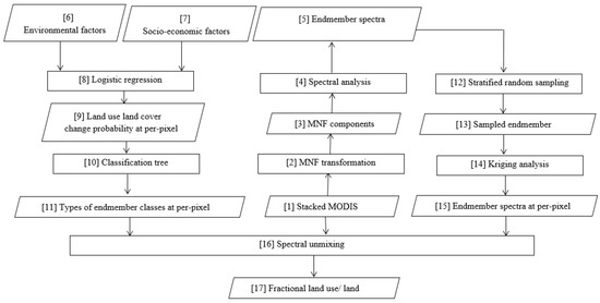 In order to automatically identify the type and number of endmember classes for each pixel throughout the whole study area, the logistic regression analysis approach and classification tree method were applied. In particular, a logistic regression analysis (Step 8 in