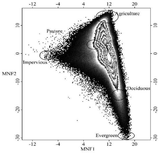Figure 2). Finally, five endmember classes (including agriculture, impervious surface, deciduous forest, evergreen forest, and pasture) and corresponding pure spectra were identified and extracted from the scatterplots of the first three MNF components and further verified with the observed data.