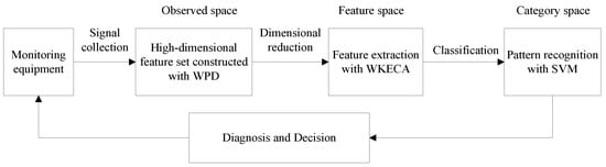 The REWPNs and EWPNs can truly reflect the diversity among different fault patterns of bearings. They are used as the high-dimensional input vector to WKECA for dimensionality reduction, which can be written as xi = [REWPN (1), ..., REWPN (p), EWPN (1), ..., EWPN (p)]T. Here, p is the number of wavelet packet node. The implementation process of the proposed fault diagnosis method using WKECA for bearings is detailed as shown in Figure 1: