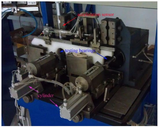To evaluate the effectiveness of the WKECA, an experimental study on fault diagnosis of rolling bearings was performed. As shown in Figure 2, the tested bearings were delivered through the automatic machinery system which contained the preset mechanism, the measuring mechanism, the sorting mechanism, and the feeding mechanism [40,41]. The radial vibration signals on one point of the tested bearings were detected by a piezoelectric acceleration sensor (YD-1, Far East Vibration (Beijing) System Engineering Technology Co., Ltd., Beijing, China) located on the top of the bearings, and amplified by a charge amplifier (DHF-2, same company as the sensor). The charge sensitivity and frequency response of the sensor are 6–10 pC/ms−2 and 1–10,000 Hz ± 1 dB, respectively, and the frequency range of the amplifier is 0.3 Hz–100 kHz. Then the signals were converted to voltage signals by an A/D converter (PCI-9114) (ADLINK Technology, Inc., Taiwan) and sent to a computer for further processing. The sampling frequency was 25 kHz, and the rotational speed of the driving motor was set to 1500 rpm.