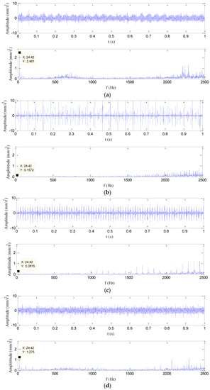 The time domain and frequency domain figures of vibration signals for the four bearing conditions: (a) normal condition, (b) inner race fault, (c) outer race fault, and (d) ball fault.