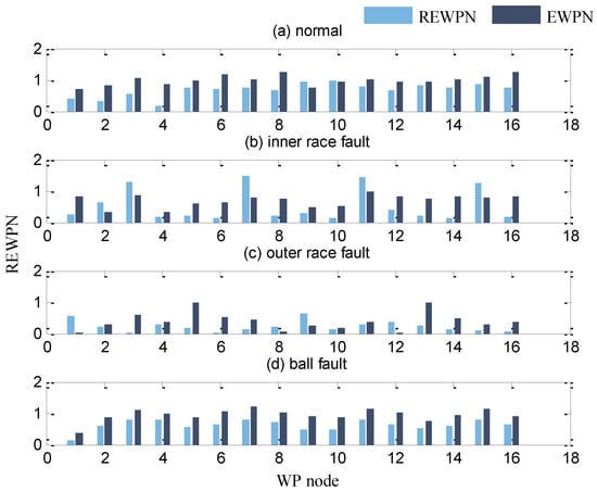 The high dimensional feature set containing REWNs and EWPNs are first constructed. The wavelet packet node energy features obtained by Daubechies2 (db2) wavelet packet decomposition were found to achieve the best classification performance for bearing fault diagnosis after many experiments on a serials of Daubechies wavelets [43]. Here the Daubechies2 (db2) is selected as the mother wavelet function to implement binary WPD for vibration signals, where the maximum decomposition level is set to 4. The normalized wavelet packet energy and wavelet packets node entropy spectrums of the bearing vibration signals are shown in Figure 4. Obviously, different bearing faults have different amplitude in different frequency bands. 32 fault features in total including 16 REWPNs and 16 EWPNs are used for fault diagnosis of bearings.
