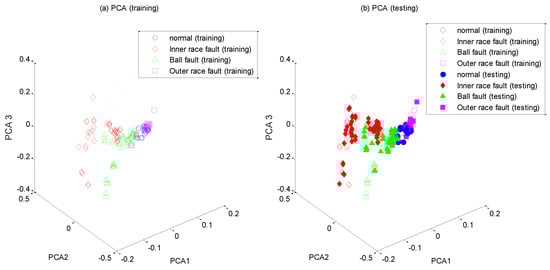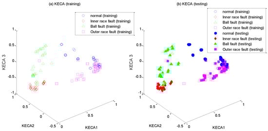 After the high-dimensional feature set is constructed, it is input into WKECA for non-linear dimension reduction, where the parameter k of the fitness function is set to 0.001. The first d most significant component vectors contributing most to the Renyi entropy are extracted by WKECA, and similar methods including PCA, KPCA and KECA are conducted for comparison. The target dimensionality for every method is set to a certain number so that the cumulative variance contribution rate is more than 95%. For visualization, the plots of the first three principal components of their projection results are shown in Figure 5, Figure 6, Figure 7 and Figure 8, where Figure 5a, Figure 6a, Figure 7a and Figure 8a represent the training results, and Figure 5b, Figure 6b, Figure 7b, and Figure 8b represent the testing results. It is evident that PCA, KPCA and KECA are not well separated those four classes because some samples are overlapped, which will lead to low recognition accuracy. By contrast, WKECA has little misjudgment samples: the testing points are consistent with the training points in WKECA, and the WKECA algorithm can obviously identify different classes both for the training samples and the testing samples. It proves that WKECA has better clustering performance than PCA, KPCA and KECA, because WKECA introduces the fault class label information and a weight strategy into feature extraction, which is conductive to pattern recognition.