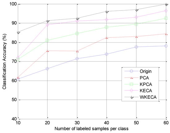In order to investigate the performance of WKECA in handling the Small Sample Size (SSS) problem with different training sample sizes, PCA, KPCA and KECA were conducted for comparison. Figure 9 presents the recognition rates of the four feature extraction methods and the original features with different numbers of labeled samples. It is obvious that the classification accuracy increases with the raising of training sample sizes. This reveals that the feature extraction based on manifold learning can improve the recognition performance, and WKECA performs better than other methods in achieving high classification accuracy. The effects of SSS problem are obvious in other methods when only ten samples are used for training, while WKECA is less sensitive to the training sample size. This proves that WKECA can capture the intrinsic geometric structure embedded in the data and achieve efficient performance in feature extraction and classification.