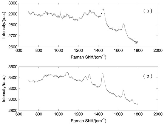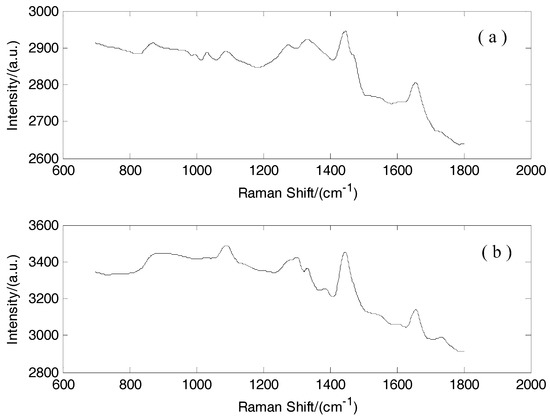 From the original spectra without preprocessing (Figure 1), the noises and fluorescence backgrounds exhibited a serious influence on the spectra and decreased the discrimination accuracy. Thus, the noise was removed by wavelet transform. The Symmlet-5 wavelet filter and four-decomposition scales were adopted to smooth the Raman spectra (Figure 2). The fluorescence background was removed by a third-order polynomial function. The Raman spectra of normal and cancerous tissues after preprocessing are shown in Figure 3. The Standard Deviation values are also shown in Section 3.2. The normalization was performed across the samples. In order to eliminate the effect of different excitation light energy and spectral collection efficiency on the whole spectrum, it is convenient to compare the intensity of the spectra and different Raman signals.
