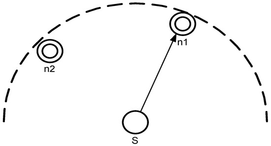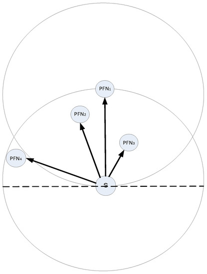 The mechanism of a forwarder set is same for all the schemes (Improved Hydrocast, Co-Hydrocast, and Co-Improved Hydrocast). In the proposed schemes, sensor nodes are assumed static [21,22], all nodes find their neighbors and sub neighbors, and calculate their Euclidean distance with neighbors. Suppose that a source node has a set of neighbors in which k neighbors are sorted based on their progress towards the destination and the packet delivery probability [23]. The priority is given to nodes that are closed to the sink with at least one neighbor as shown in Figure 3 that source node S has two lower pressure level neighbor nodes and . has lower pressure level and it is closer to the destination, so it is selected as a next hop forwarder and calculated according to Equation (1).