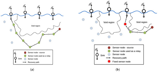 In Hydrocast [4], the authors introduce a recovery mechanism called lower depth first method, for routing data packets from void nodes. Data packet drop issue is minimized to some extent via this recovery method and the protocol shows good performance when the network density is high. However, long recovery paths are established for data packet delivery from void nodes in the sparse network conditions as shown in Figure 2a. When the network density decreases, the probability of a lengthy recovery path establishment increases, due to which many nodes are involved in forwarding data packets to the nearest sink. This problem results in high average end-to-end latency and high energy consumption in the network.