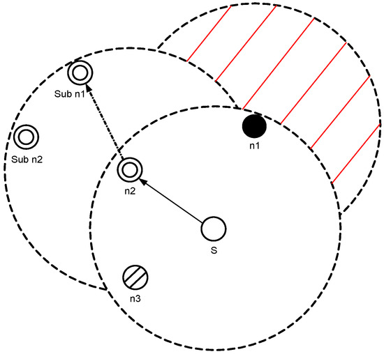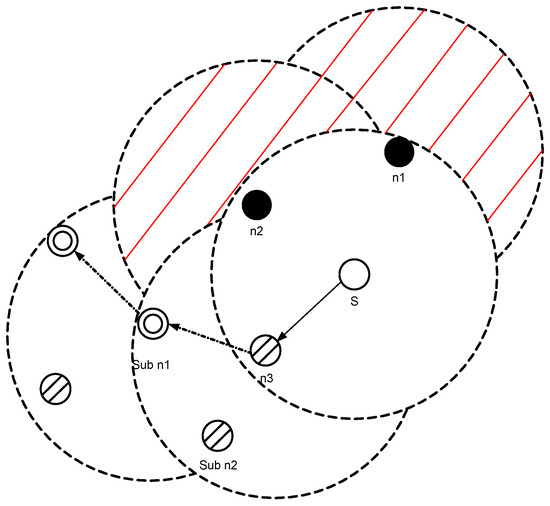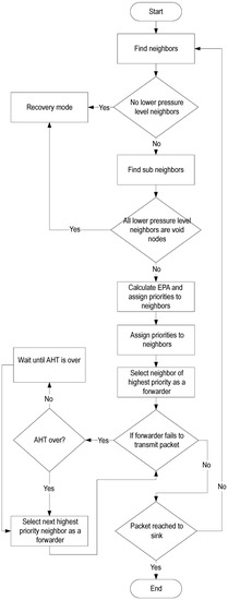 A void node is not selected as a forwarder as shown in Figure 4, S has three neighboring nodes , and within its transmission range. is a void node, and has higher pressure level than S. is not a void node and it has two neighbors (sub and sub ). also has lower pressure level than S, therefore has the highest priority to be chosen as a forwarder. The expected packet advancement (EPA) [24] is given in Equation (2).
