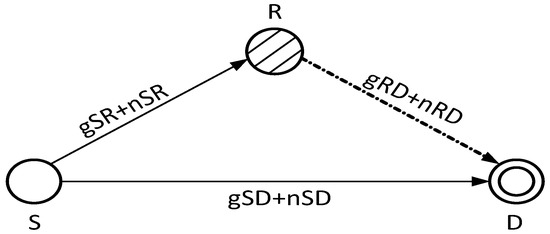 Figure 7 shows the basic cooperation technique procedure, S transmits its data packet to the destination node D directly and via a relay node R. Here, the noise and the fading are denoted by n and g, respectively. The relationship between the transmitted and the received signals are given in Equations (21)–(23) [27]. The faded signal received at D directly from S is given as below: