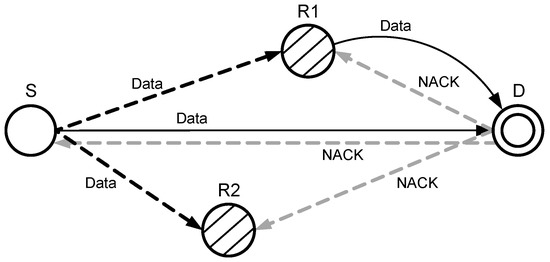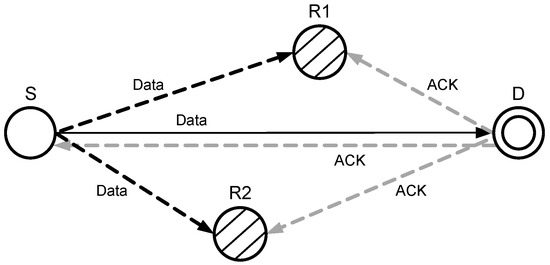 When a source node transmits a signal towards a destination node, it is overheard by other neighboring nodes, and they keep a copy of the received data packet. Destination node after receiving the source node signal, checks if SNR meets the threshold or not. If the SNR is (according to Equation (17)) within the acceptable range, then the destination node accepts the received signal and broadcasts an acknowledgment (ACK), as shown in Figure 8. After receiving the ACK, the relay nodes discard the stored copy of the source node signal.