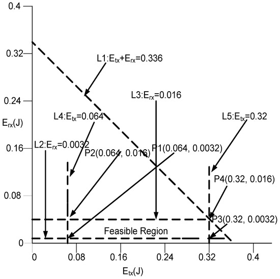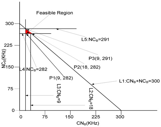 The bounds provided by Equations (55)–(57) are shown in Figure 11. The intersection of lines L1, L2, L3, L4, and L5 shows the bounded region of all feasible solutions. Each point in region gives a valid solution and each vertex of feasible region is tested that depicted by Figure 11.