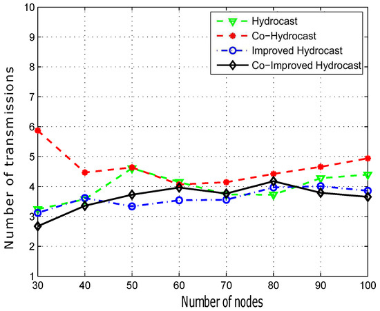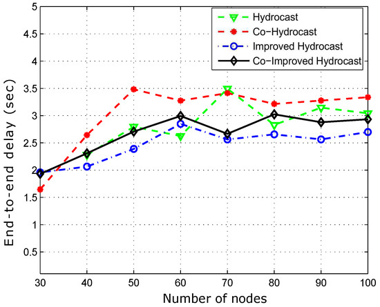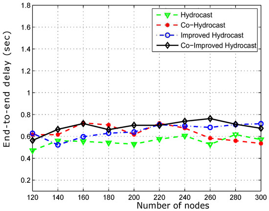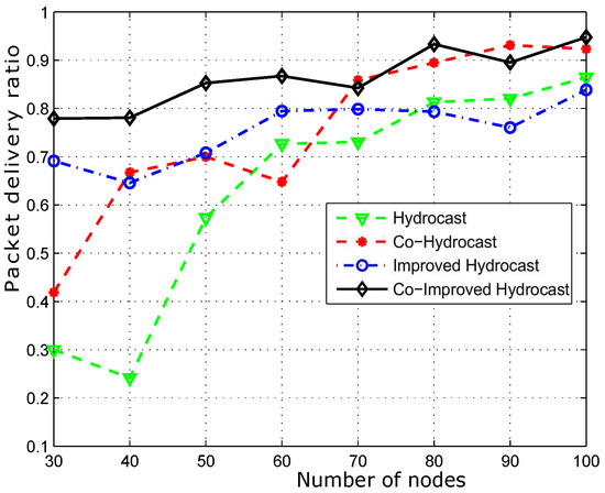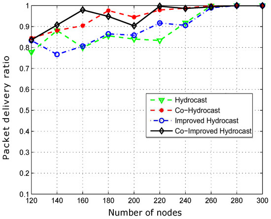 Figure 12 shows the packet delivery ratio. Hydrocast has low throughput when the network density is low. The reason is that the breakage of established recovery paths for void nodes due to the mobility of sensor nodes. In sparse network conditions, more void nodes are found that need recovery paths for the data packet transmission. As the network density increases, the number of void nodes decreases, and ultimately less number of recovery paths are established in the network and vice versa. Improved Hydrocast shows better performance due to the deployment of nodes at the strategic locations in the network. Co-Hydrocast also has better results than the Hydrocast due to the cooperation technique in Co-Hydrocast. Whenever, a data packet fails to successfully reach the destination, or the received signal SNR according to Equation (17) is lower than the threshold, MRC technique is used to combine signals for avoiding re-transmissions. Co-Improved Hydrocast outperforms all compared schemes, and has the highest packet delivery ratio. It takes the advantage of both opportunistic cooperation and strategic location mechanism to improve the PDR of the network nodes.