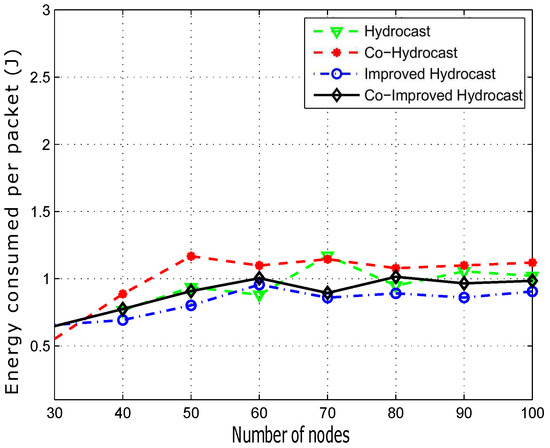 Average energy consumption of successfully transmitted data packets is plotted in Figure 17. Hydrocast consumes less energy for a data packet delivery when the network is denser due to less number of void nodes, short recovery paths and no cooperation. Co-Hydrocast and Co-Improved Hydrocast schemes have high energy consumption due to opportunistic cooperation technique which has influential factor of redundant transmissions between the source and the destination which leads to high energy consumption in dense networks as shown in Figure 17.
